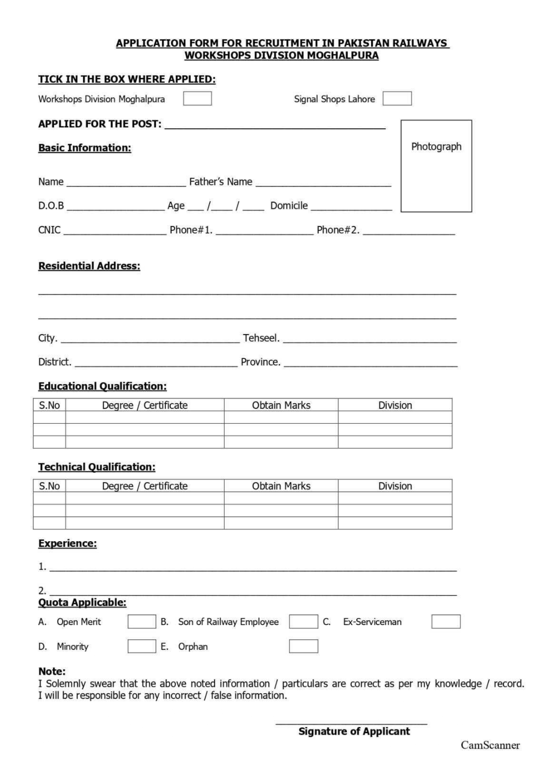 - Postal Order: Attach a Postal Order of Rs. 100/- (non-refundable) in the name of the Divisional Superintendent Workshops, Pakistan Railways, Moghalpura.